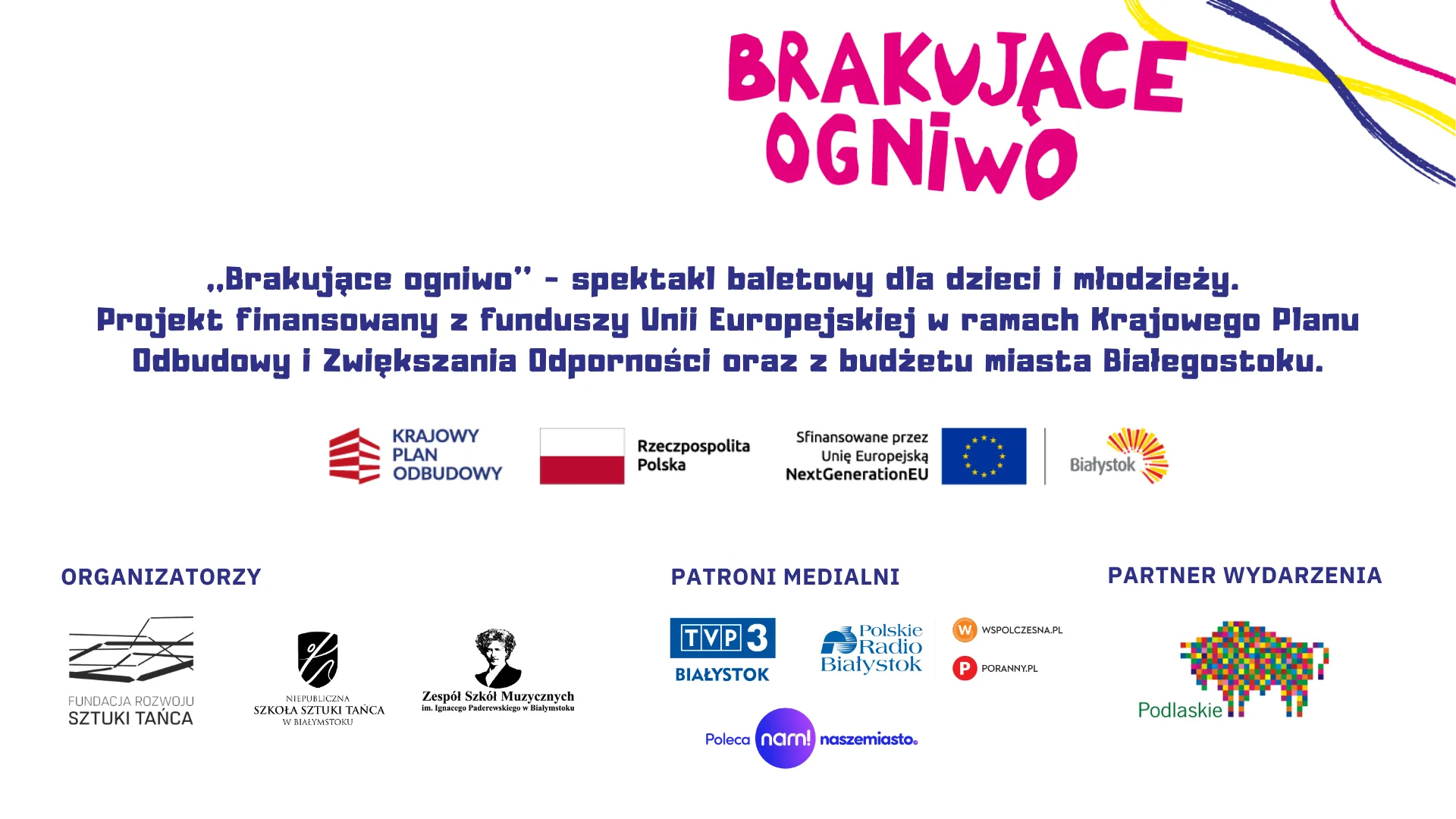 Dzięki dofinansowaniu otrzymanemu przez Fundację Rozwoju Sztuki Tańca w Białymstoku z Unii Europejskiej w ramach Krajowego Planu Odbudowy i Zwiększania Odporności, „Brakujące ogniwo” zostanie wznowione. Spektakle już 16 stycznia 2026 r. o godz. 16:00 i 18:30 w Sali koncertowej Zespołu Szkół Muzycznych w Białymstoku przy ul. Podleśnej 2.